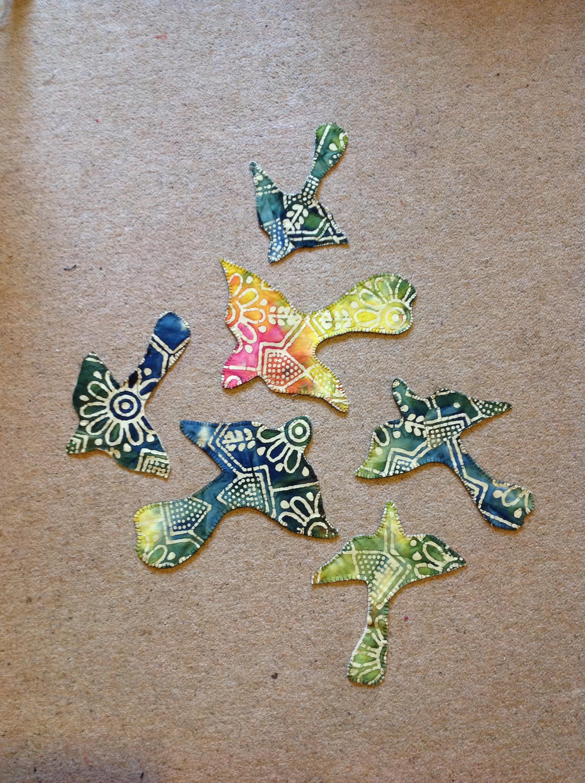 Last night we finished hand sewing the birds using black stitching around them. The green bits of the Batik fabric seemed to work best in the colour scheme.