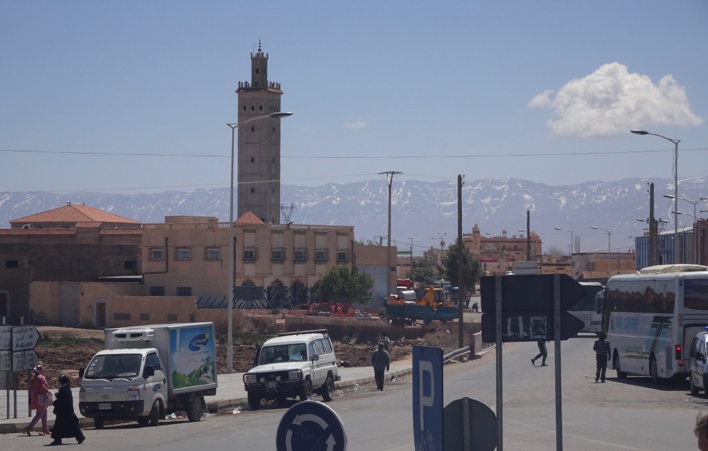 We sat on the the wide verandah at the red topped tables watching the world go by whilewaiting expectantly fro our burgers. A local family were already tucking into their meal. Out the front, more cooking, with rows of orange tagines complimenting the blue china plates laid on our table. Across the street we spied a fruit and vegetable stall to buy fruit for later, and the universal truckstop fast-food pitstop Pizza Hut, its dusty sign holding no allure for us.