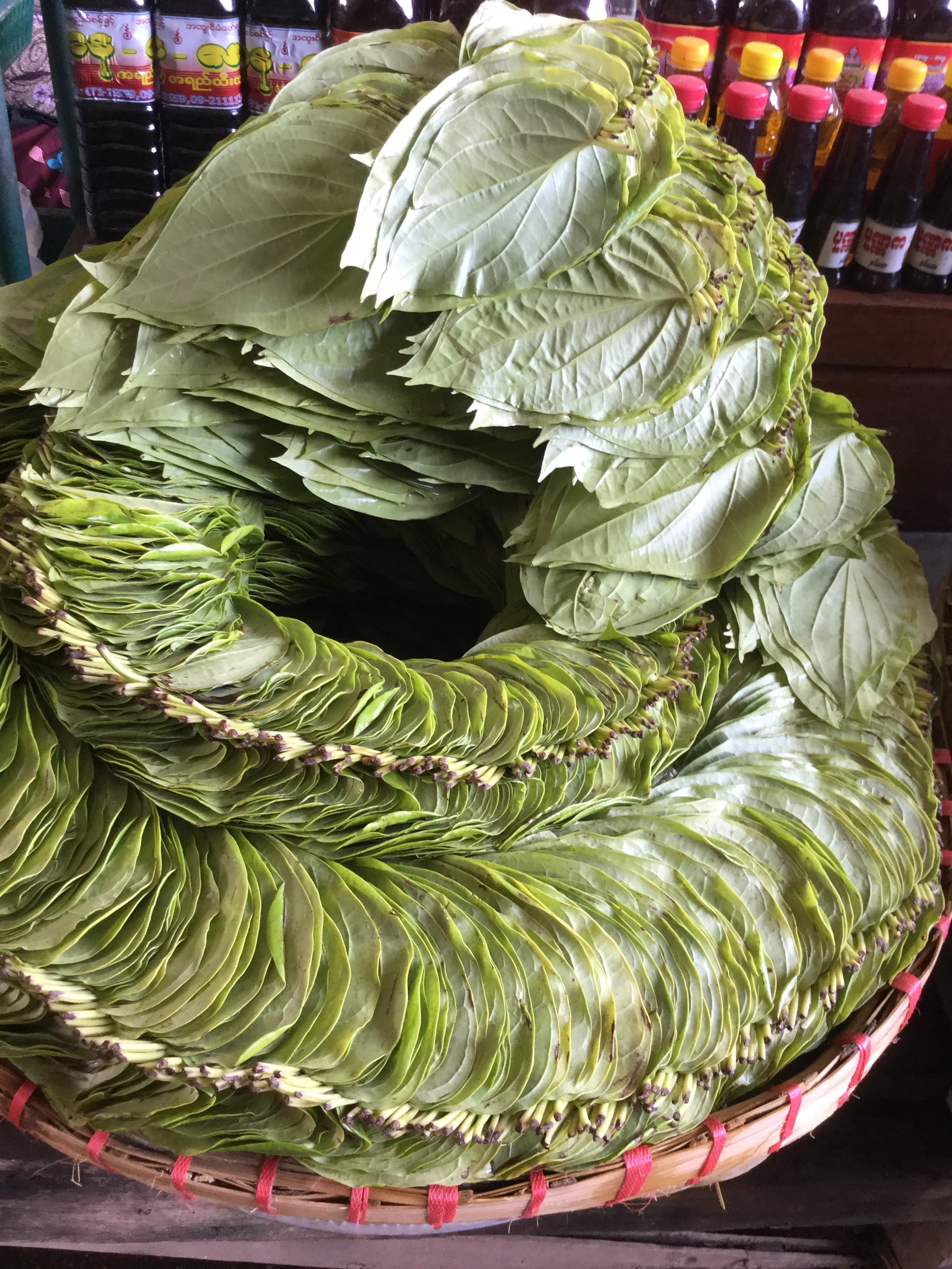 What an enticing way to display this vine leaf, in a market at Magwe Myanmar. Betel leaf can be used to wrap foods such as peanuts or shrimps for a nutritious snack, cooked or added to salads. Not to be confused with betel nut which is the fruit of the Areca palm.