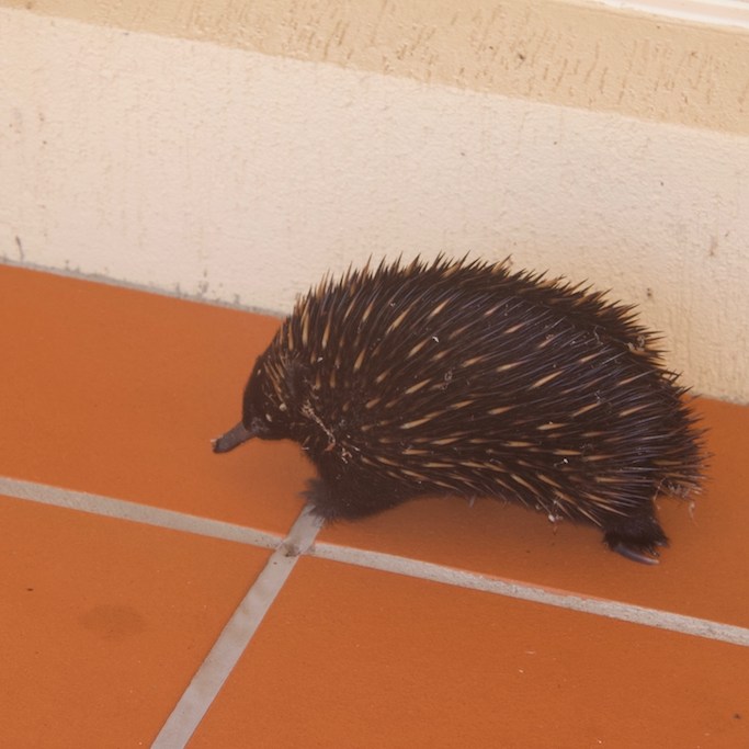 He waddled across our veranda, then settled in the sun against the side wall, protected from all by my mosaic snake.