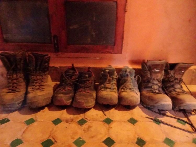 Because I am not a professional photographer, the photos I take are not always the best shots technically. I snapped these hiking boots at a trekking lodge in the Azzaden Valley in the Atlas Mountains, without stopping to focus or compose the shot. Our the guide was ready to set off for the day so I needed to remove my walking shoes from the line-up and lace them up post haste!
