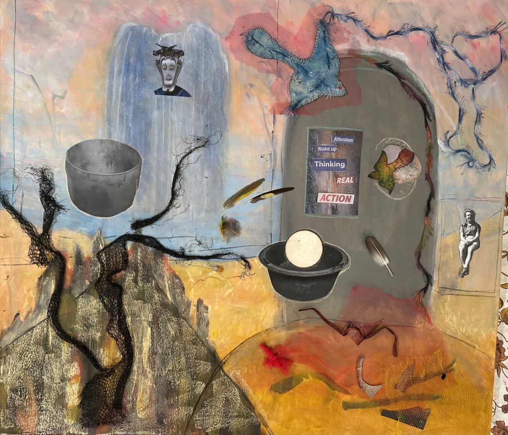 My creative friend Helen and I had a great time playing with collage images when she came up from Melbourne. We had bounced around artistic ideas. Helen has a natural talent for composition plus a really imaginative approach to collage. Here’s a joint work in progress.