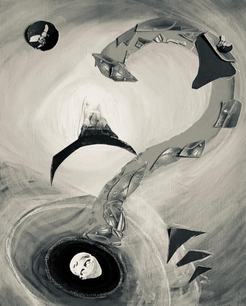The works that evolved years later play with time, uncertainty, mortality. All of the collage pieces come from digitally recoloured photos taken on that night. And the question is? Well it’s not so much about THE question as about ASKING questions.