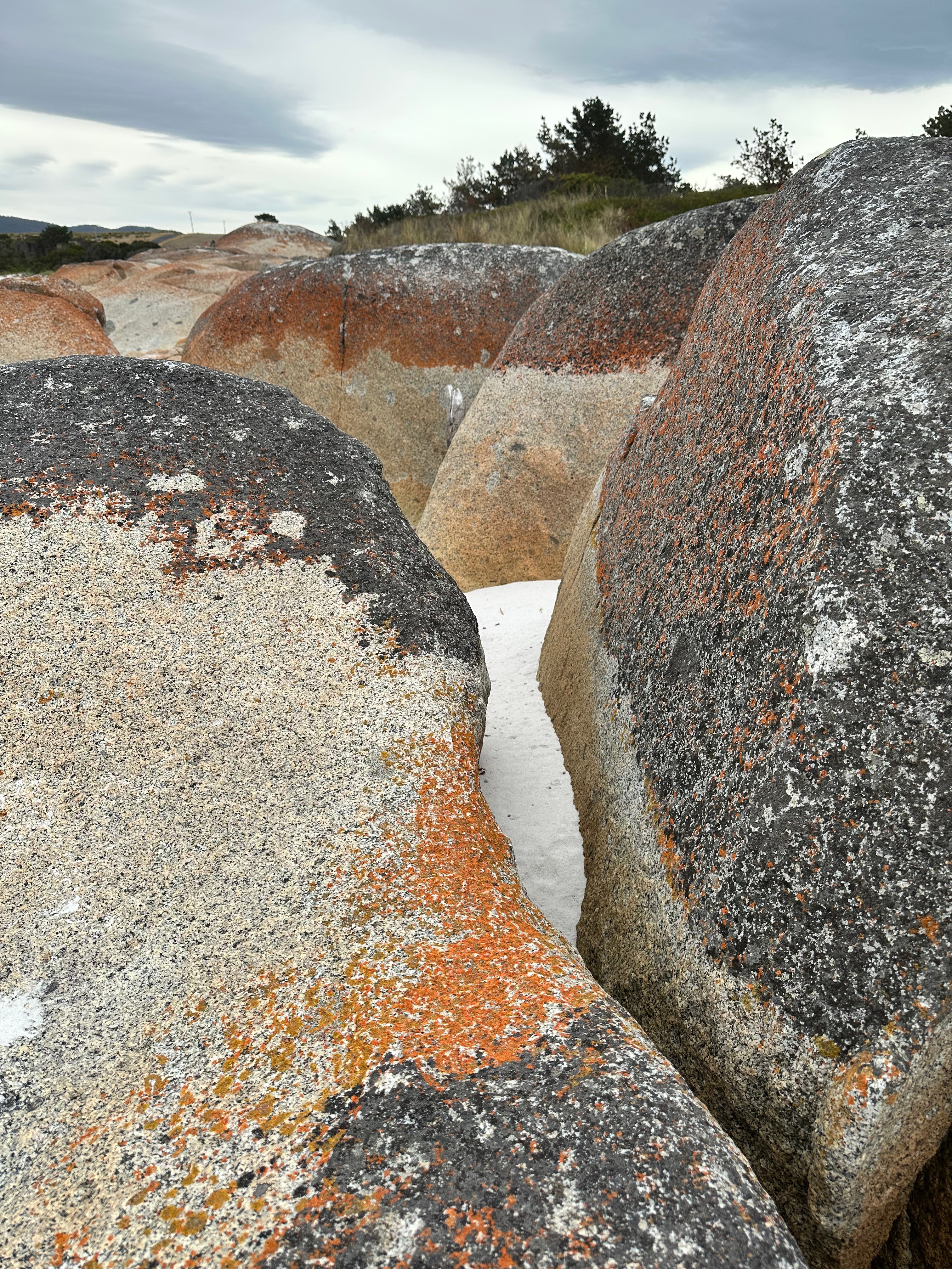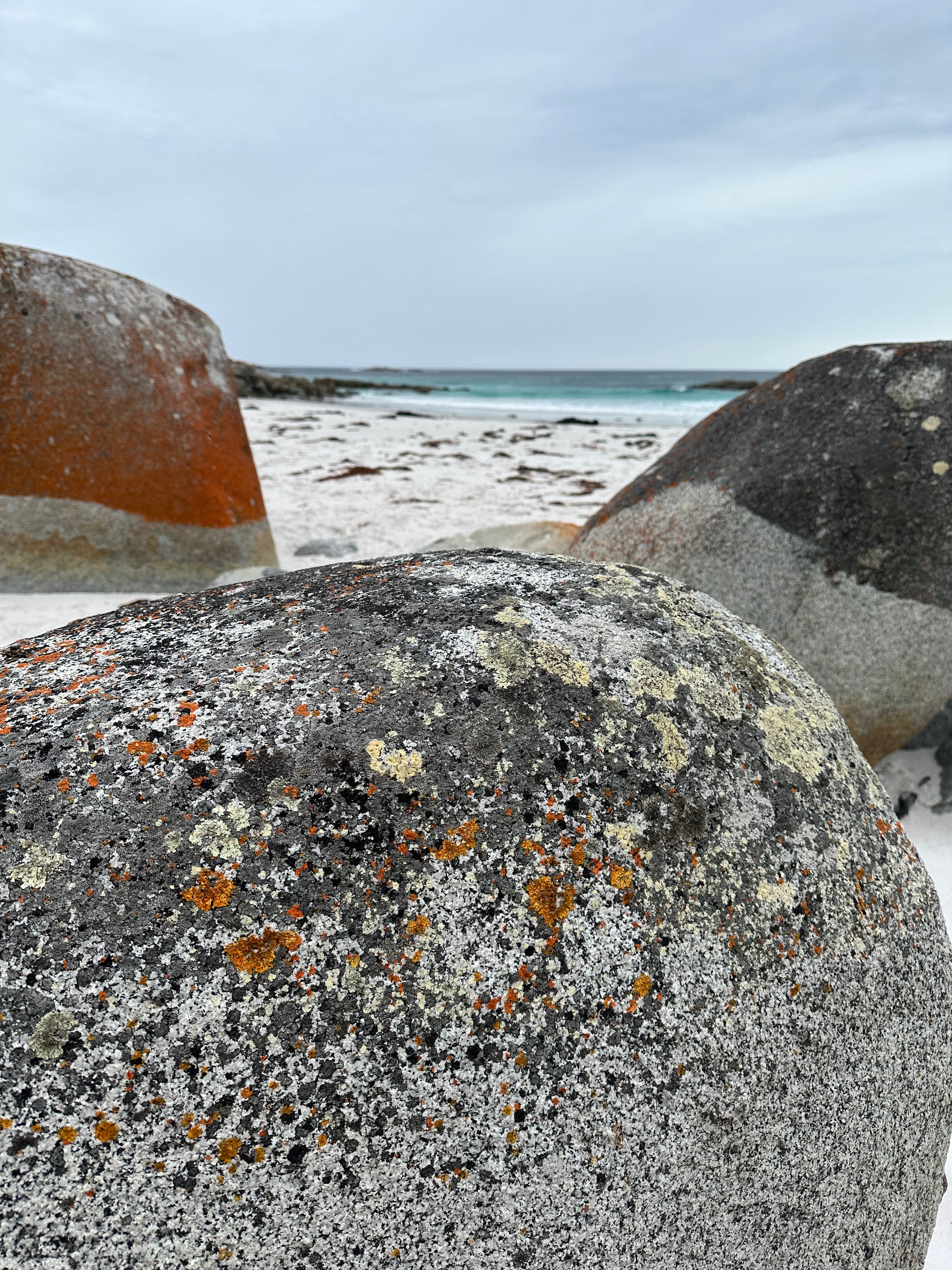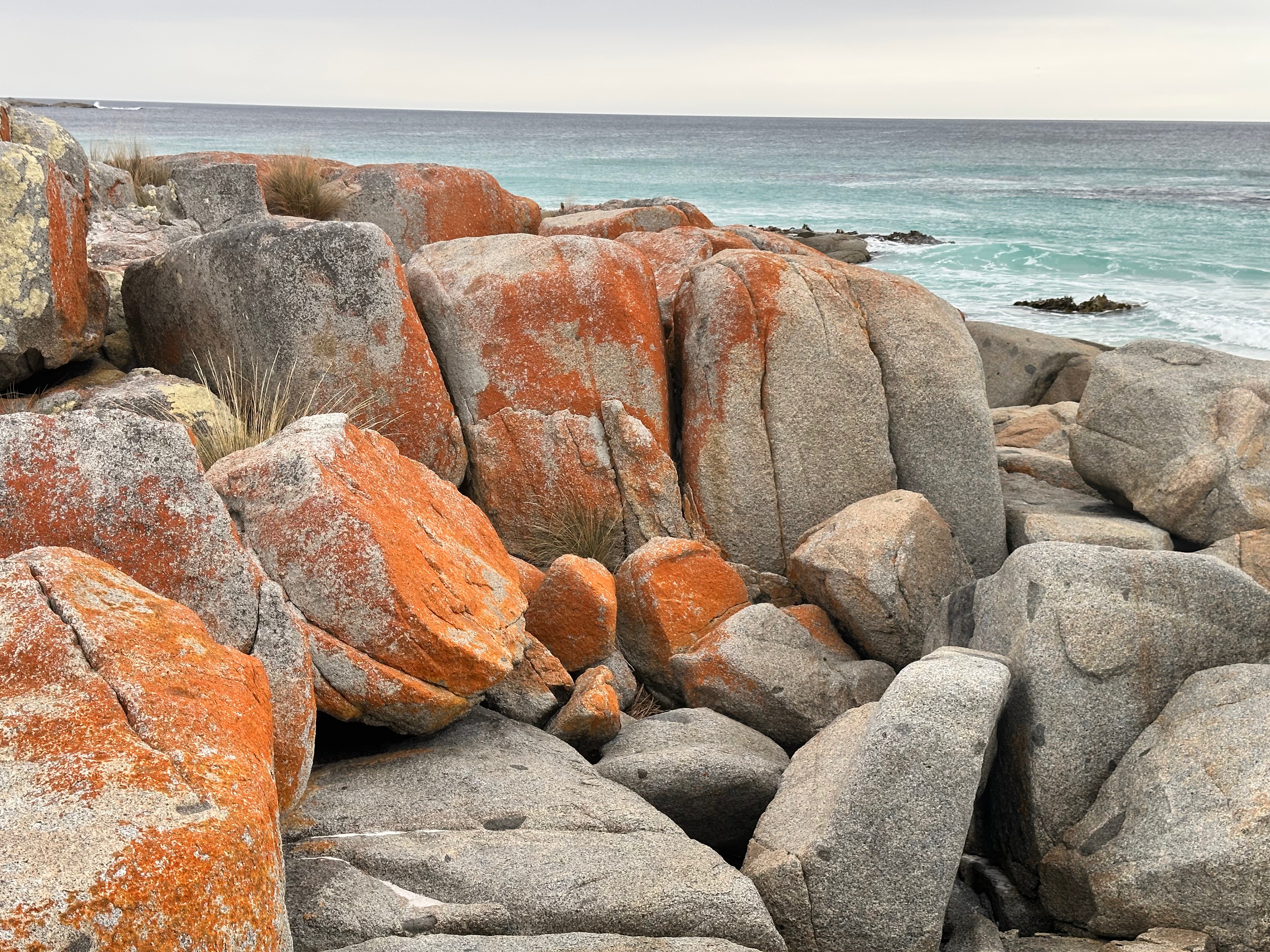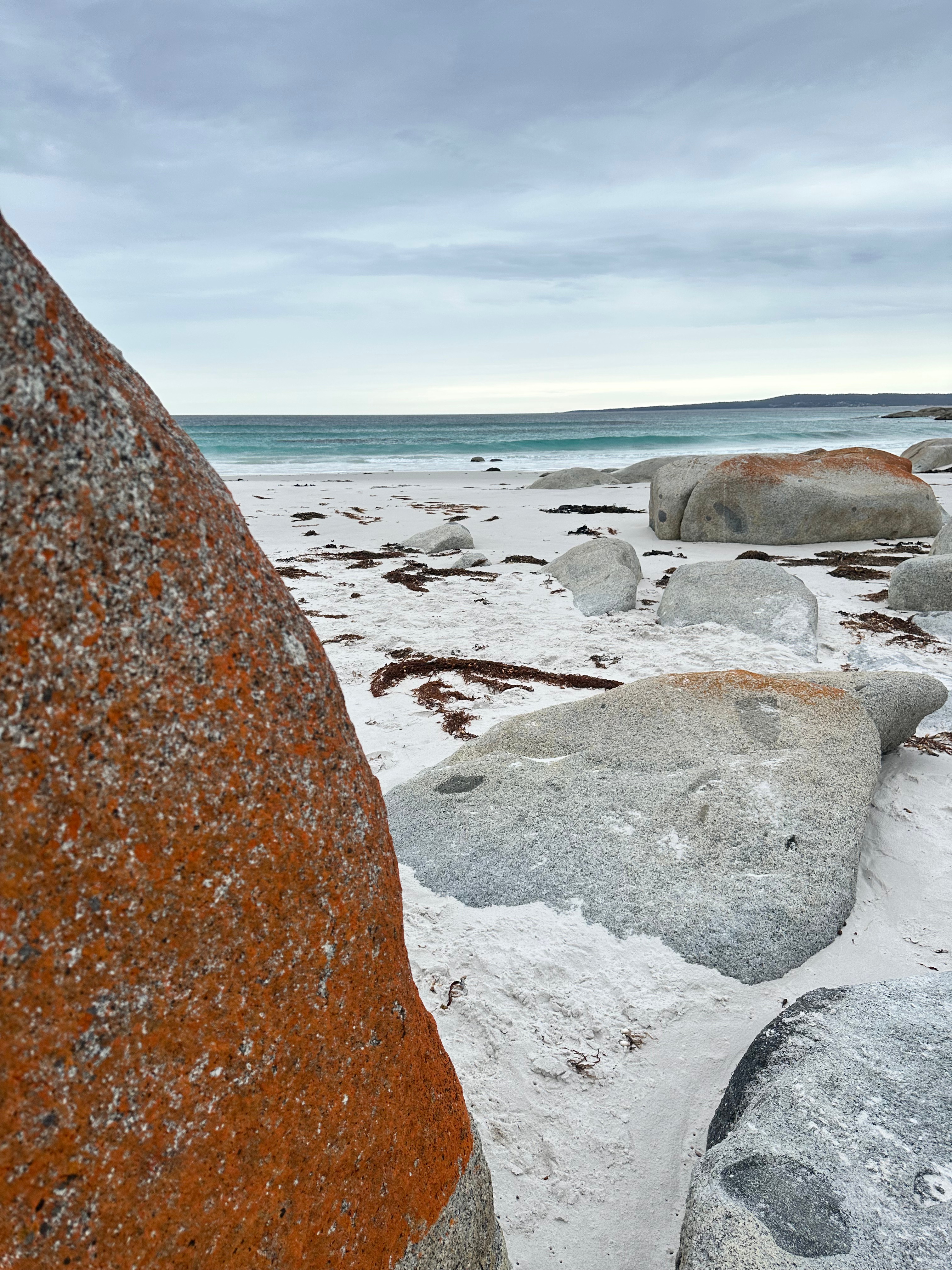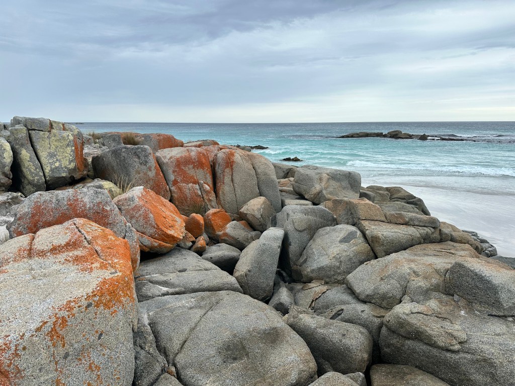 These are the colours of the Bay of Fires, a marine conservation area on the north-east Coast of Tasmania. Granite bedrock, ground into fine grains, becomes the pristine, soft white sand of the beach. The water is ice-cold blue, but so clear. Nature brings together what we humans call a complimentary colour scheme. Bursts of orange lichen cover the rounded granite boulders to complete the beautiful picture.