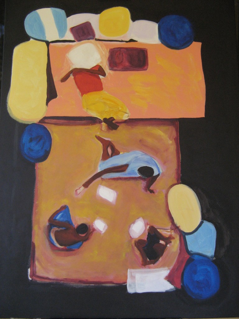 This series of paintings and digital collages is a compassionate response to a photo journalist’s image of people in an evacuation centre. The photo appeared in Time Magazine in 2009. Taken looking down, it was a sea of mosaic colour.