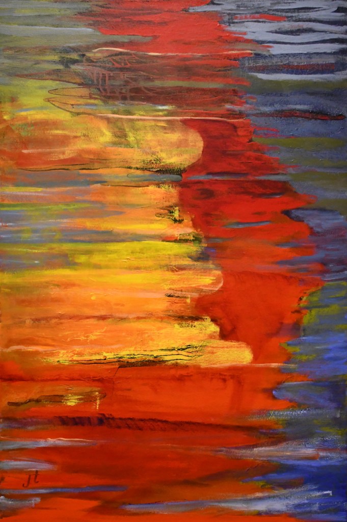 Here’s a painting that lies halfway between abstraction and realism. Originally a purely abstract painting, it morphed into a study of reflections in the water of a red dress,